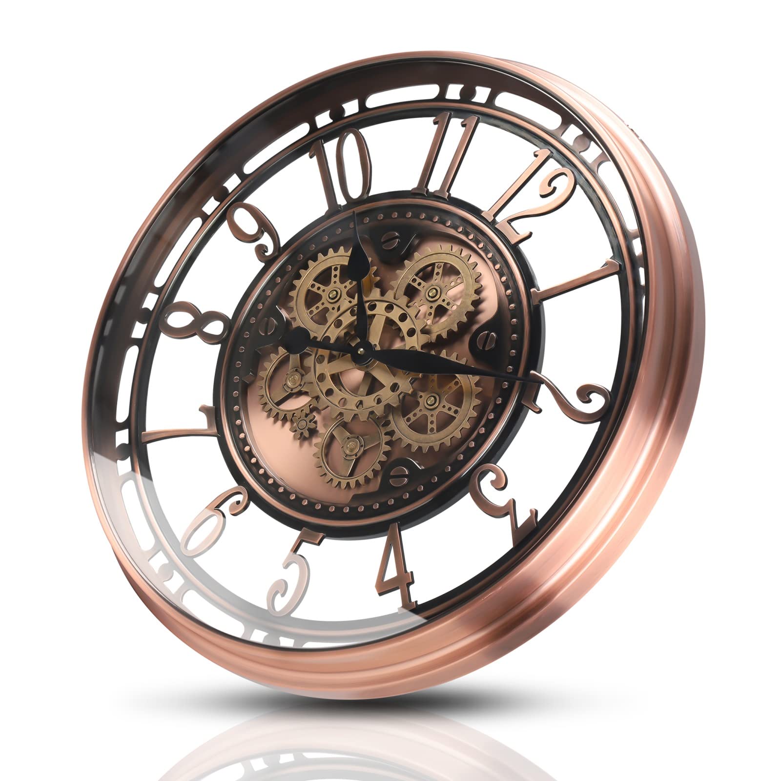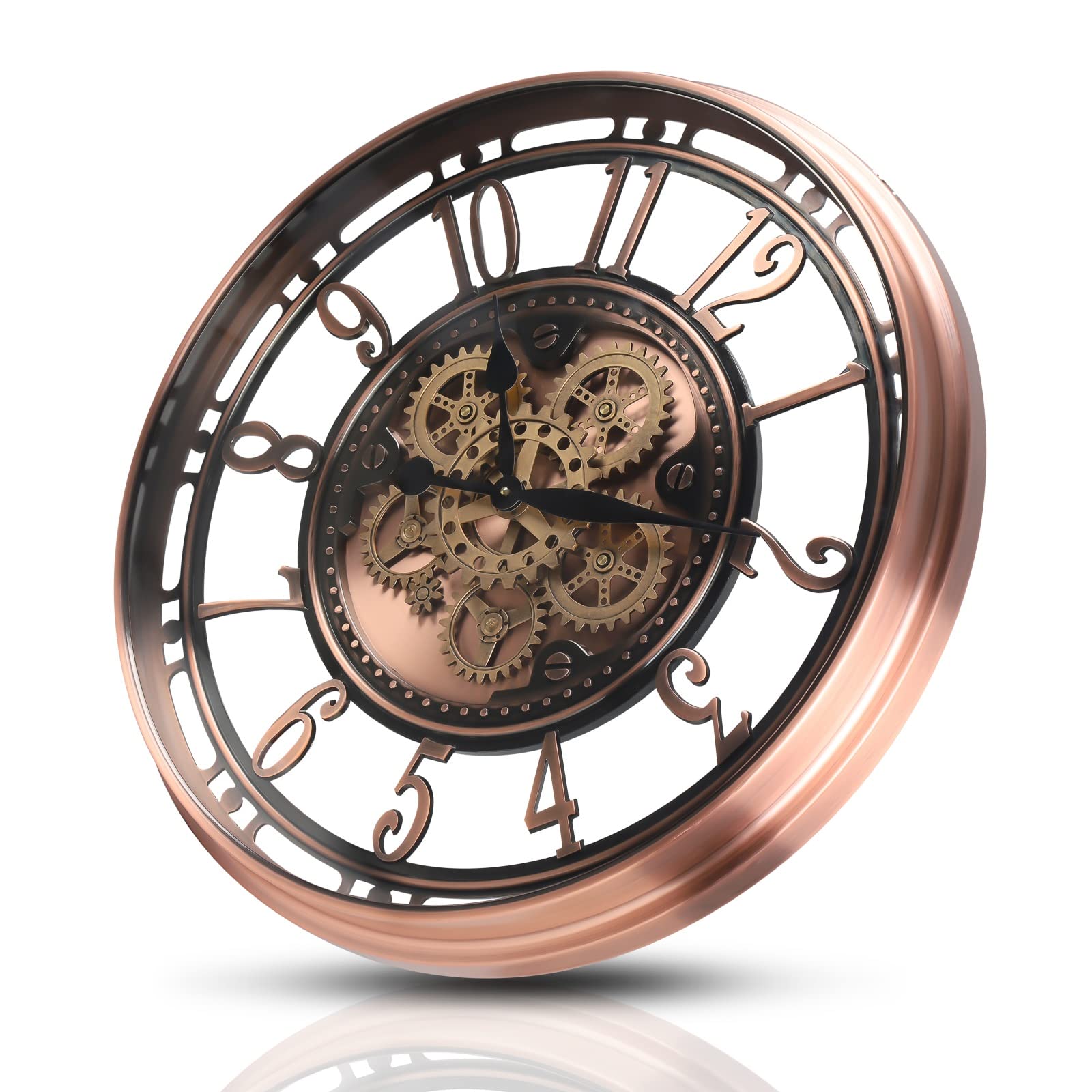 Aged Rose gold copper colored background shadows behind the distressed brushed gold gears for an engaging steampunk vibe look.The sturdy time set wheel adjusts to any location in the world. Let your clock tell more than just time!